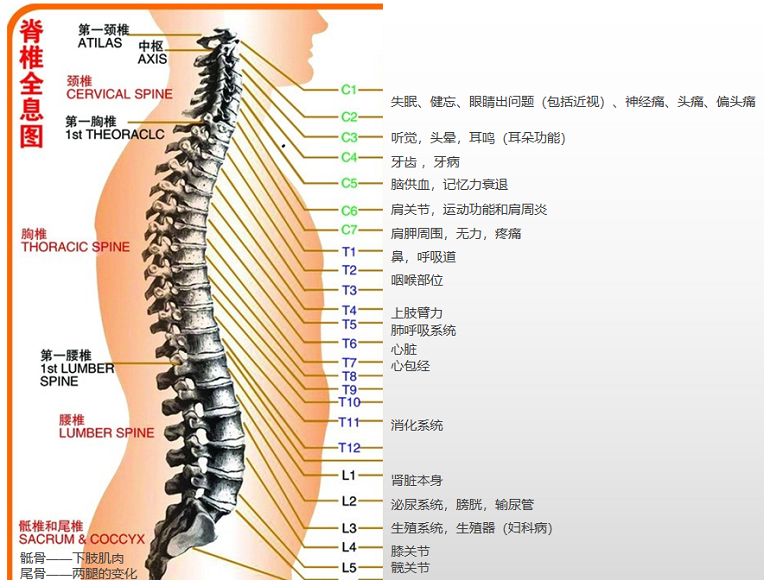 小结:颈椎统管肩周以上病变,与脏腑疾病无关。胸12+腰第1椎,统管脏腑病变。其中,胸8-12椎对应消化系统疾病。骶骨和尾骨统管下肢疾病。